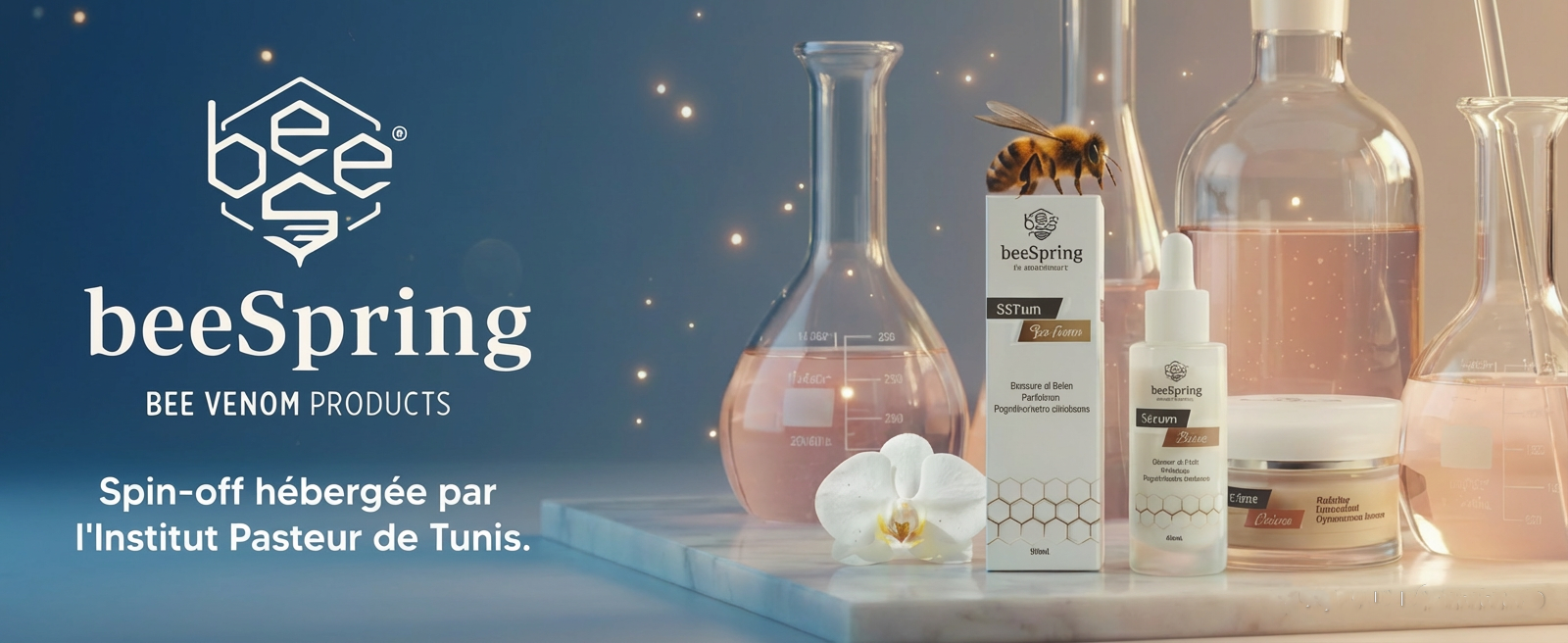 BEE SPRING est une spin-off tunisienne de recherche et développement (RD), hébergée à l’Institut Pasteur de Tunis, spécialisée dans la formulation de soins dermo-cosmétiques innovants inspirés du venin d’abeille. Le venin d’abeille, notre signature scientifique.